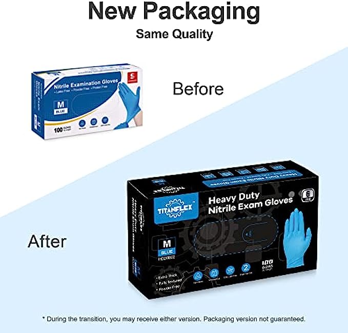 Imported 6-mil HEAVY DUTY: Our thick nitrile disposable gloves are chemical & puncture-resistant, providing a higher level of hand protection against liquids, greases, & sharp objects. The textured finish provides slip resistance in wet or dry conditions. LATEX GLOVES: Our disposable latex free gloves are non-irritating and hypoallergenic, offering superior strength and snug comfort - perfect for users with allergic skin reactions. It vastly reduces cross-contamination among users of sensitivity. FOOD SAFE GLOVES: Our disposable rubber gloves are food grade that can be used as disposable food gloves, cooking gloves, food handling gloves, and food service gloves. MULTIPURPOSE: Our non-sterile non-latex gloves can be used for household, industrial and commercial tasks, e.g. cleaning gloves, cooking gloves, food prep gloves, tattoo gloves, mechanics gloves, barber gloves, BBQ gloves, painting & animal handling. SIZES & PACKAGING: Our single-use gloves come by 100 pcs in a dispenser box, and 10 boxes in a case (1000 gloves bulk). These ambidextrous gloves are in small, medium, large and extra large (XL) sizes, suitable for men and women.