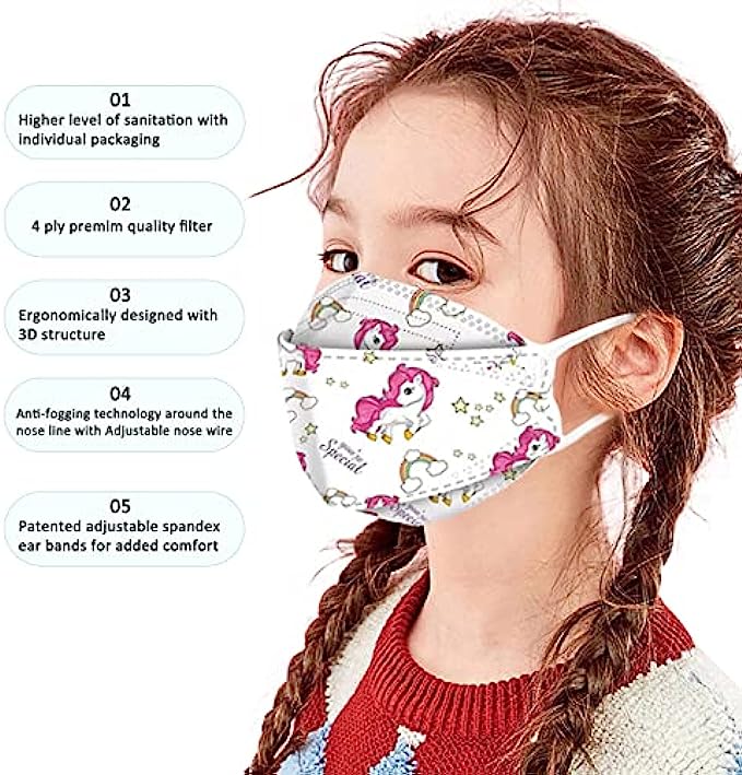 【Exclusive Design】: The KF94 fish mouth design can form a perfect wrap from the chin to the bridge of the nose without leaving a gap. At the same time, it can prevent the mouth from contacting the mask, which increases the safety level and has the best wearing feeling. 【Product Introduction】: kids disposable face masks,The folding specification is :17*7CM, the unfolding is :17*15 CM, four layers of protection, can be close to the face, get the best protection effect, the ear hook is 6CM, the longest stretch is 18CM, and the elasticity is excellent. 【Four-layer Material】: the outermost layer is made of printed non-woven fabric, and the middle layer is made of two layers of melt-blown fabric, which can effectively prevent PM2.5 and protects up to 95%. The last layer is made of skin-friendly non-woven fabric, which fits the face without hurting the skin . 【Strong air Permeability】: Because the fish mouth shape design reserves a larger breathing space, a part of the air is reserved in the empty slot. This design will have better air permeability than ordinary masks and easier to breathe. Glasses will not be so Foggy. 【You Will Get】: 6 patterns, each 10 pieces individually packaged, a total of 6 packs (60 pieces)