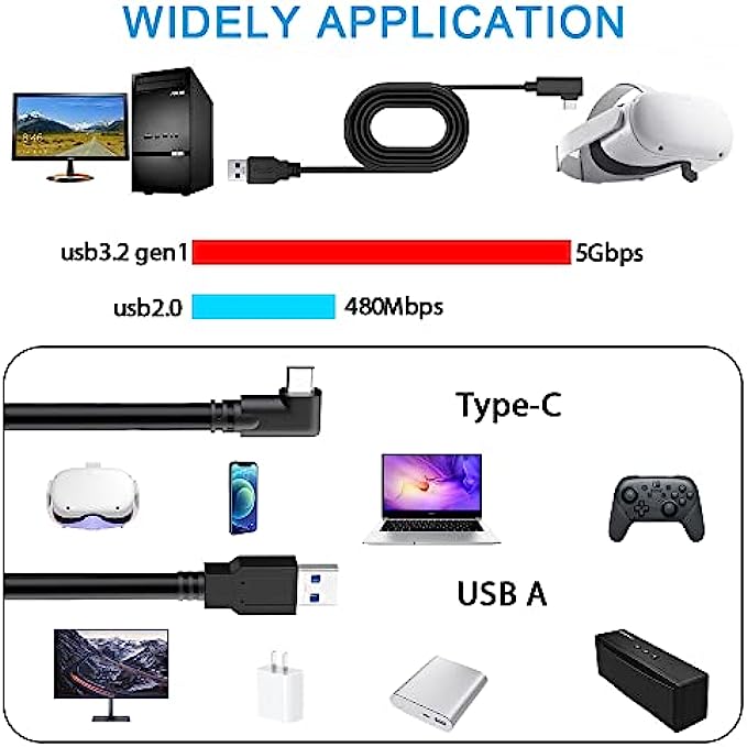 • LINK CABLE: 16-foot long charger, L-shaped design, not easy to fall off, allowing you to move freely without restriction while playing games. 90° right angle, preventing disconnection, more stable, giving you an immersive VR gaming experience. usb 3 to usb c to pc, up to 3A to charge while in use, saving charging time.