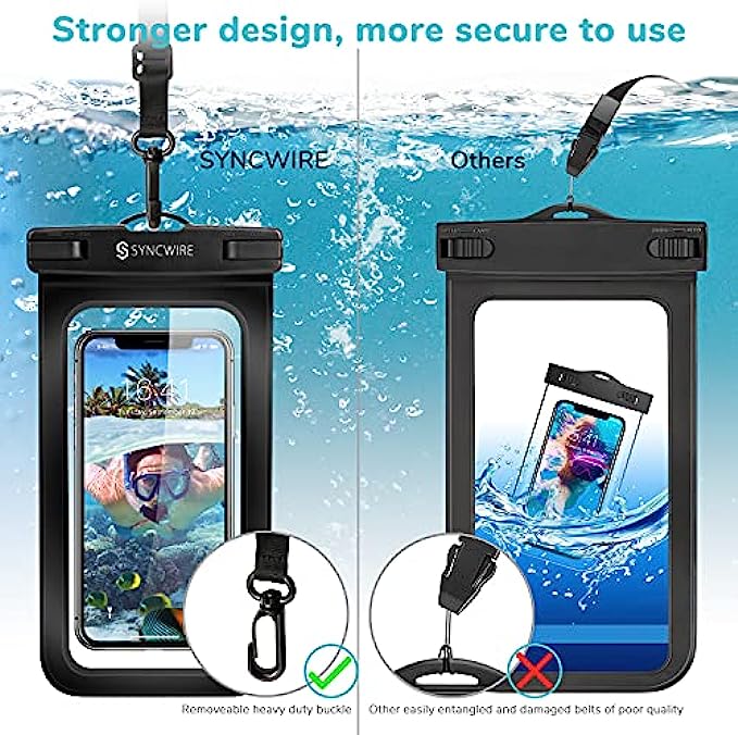 ?[Friendly Reminder]: This waterproof pouch is not recommended for mobile phones with thick cases (e.g., OtterBox). Please remove the thick phone case before placing the phone into the dry bag. The phone may be affected by hydraulic pressure at certain water depths, which will affect the operation of the touch screen. In this case, please press the volume button to take photos. Not applicable to touch ID and fingerprint unlocking. ?[IPX8 Waterproof]: With excellent waterproof seal performance (IPX8 rating), this 100% sealed waterproof bag provides comprehensive protection for devices in a variety of environments. The maximum waterproof protection is up to a water depth of 30 meters(100ft). Features include a simple snap and lock access which ensures a perfect seal, and keeps out water, snow, dust, sand, and dirt. ?[Wide Compatibility]: Syncwire dry bag is suitable for almost all cell phones up to 7 inches, such as iPhone 13/12/11 iPhone 13/12/11 Pro iPhone 13/12/11 Pro Max iPhone XS Max XR XS X 8 7 8P 7P 6s plus 6 plus se, Samsung Galaxy S22 S21 S10 S9, Google Pixel 6, etc. User-friendly design equips Syncwire waterproof phone case extra space for your card and cash, one case for all while no more wallet needed. ?♀️[Highly Sensitive Touch]: High-quality soft TPU material exclusively made for delicate touch and response. It ensures the normal use of a touch screen, camera and other functions in water (fingerprint unlocking is not supported). ?[Transparent and Portable Design]: With crystal clear windows on the front and back, this waterproof case is perfect for taking photos, videos and checking email. The adjustable and durable lanyard can hold at least 20kg and can be hung across the chest or slung across the waist for convenience. (Lanyard length: 60cm/23.6", Adjustable between: 40-60cm/15.7-23.6")